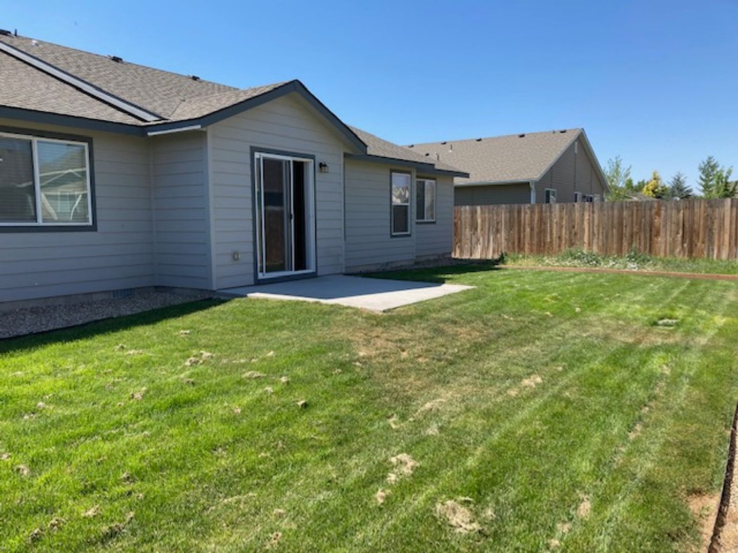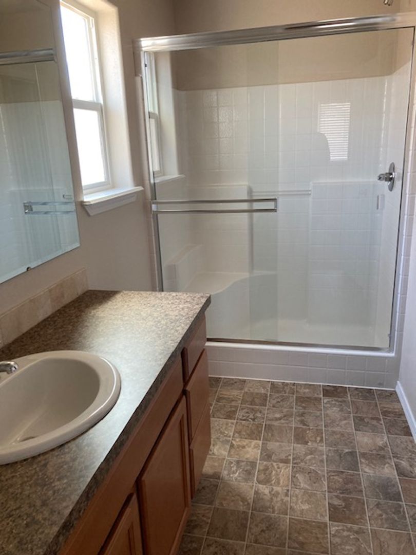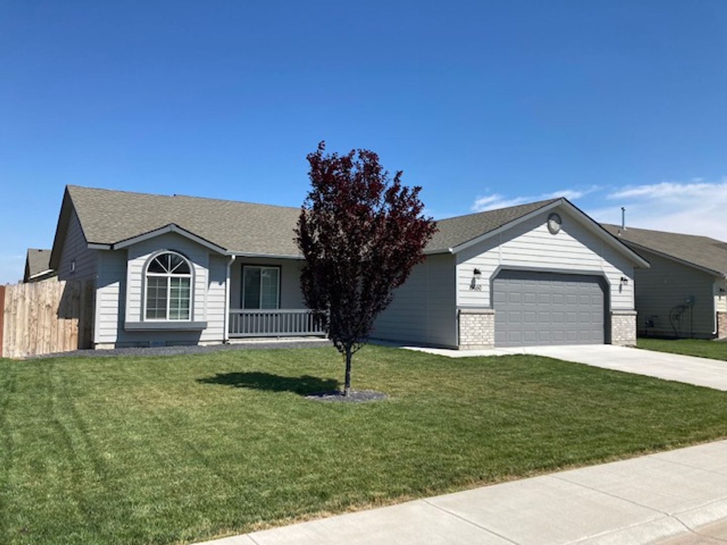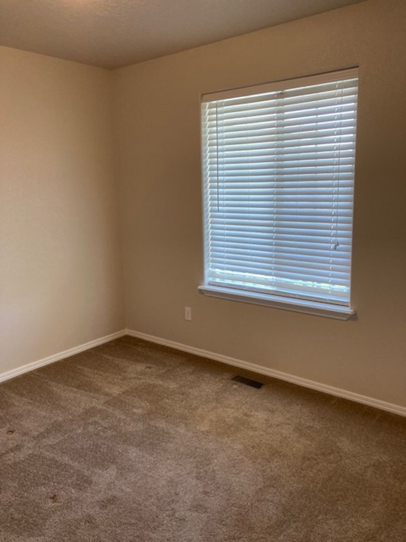 Single level home with split bedroom design. Located in new subdivision close to freeway access, parks, schools, shopping, and more. The primary bedroom boasts a large walk in closet and the bedroom has its own bathroom suite. Open floor plan with kitchen opening up to the large family room. Vaulted ceilings make this area feel very open. Good size rear yard has a gardening area ready for planting. Home has a water softener in the large oversized garage. This home is in great shape and is newer. It wont last long. One year lease required. Small dogs allowed with monthly pet fee. There is a small application fee which covers the background check.